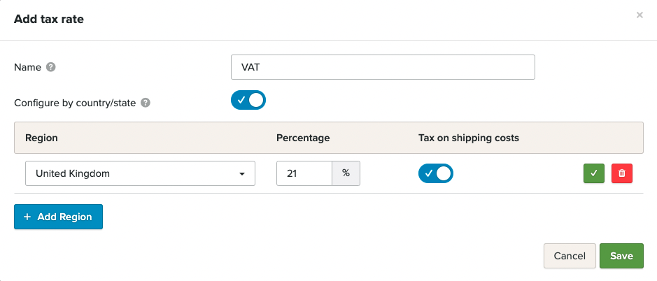 I skatte- og satser er der som standard tilføjet en salgsafgiftssats. Moms er kun gældende i USA. For at redigere denne sats skal du holde musemarkøren over den og klikke på den blå redigeringsknap. For at fjerne den skal du holde musen over og klikke på røde slet-knap.