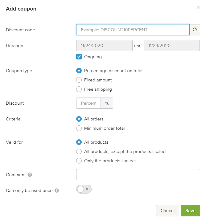 - Rabatkode: Indtast den kode, dine kunder skal indtaste ved kassen for at få rabatten.