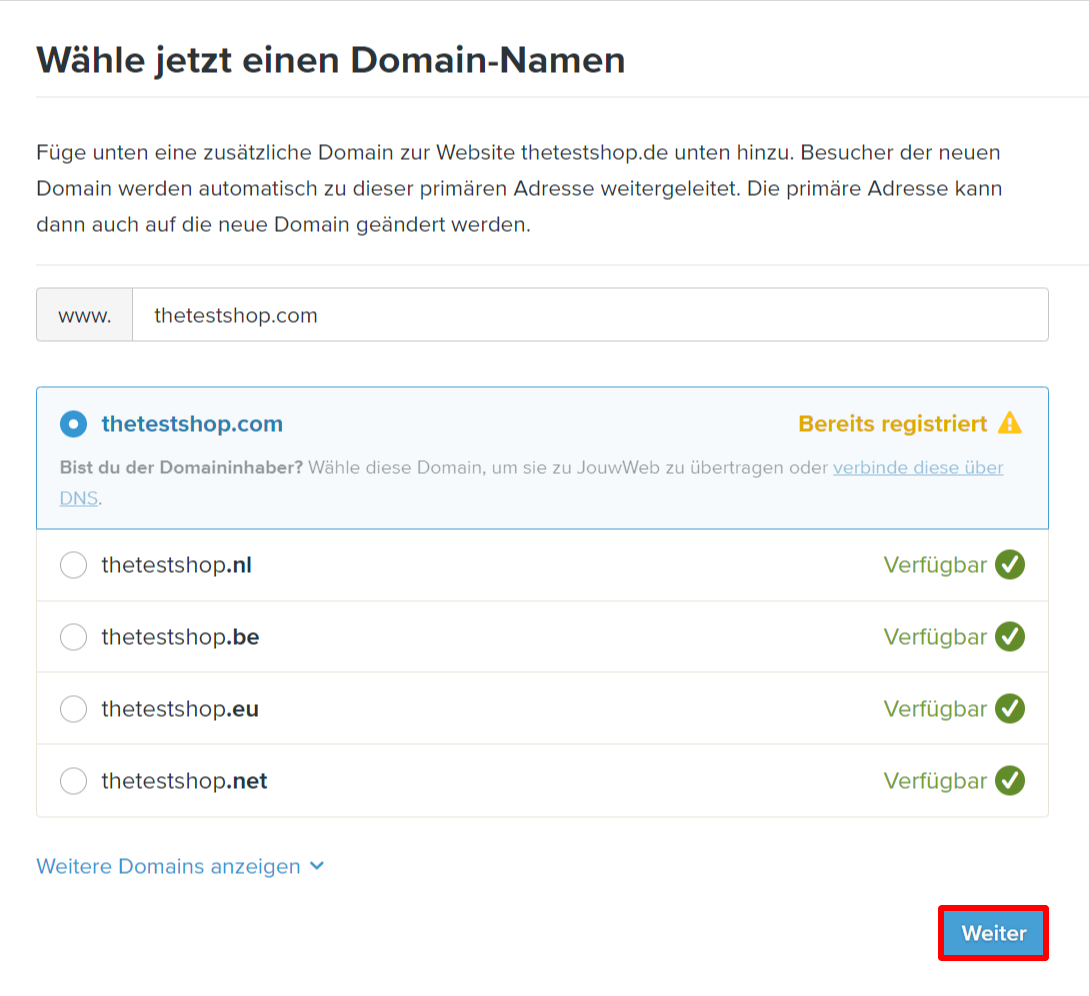 Trage die Domain ein, die du gerade verknüpft hast, und prüfe die Verfügbarkeit. Es erscheint: Bereits registriert. Das ist richtig. Wenn der Domainname bereits dir gehört, ist dieser natürlich auch schon registriert worden. Wähle deinen Domainnamen aus und klicke jetzt auf Weiter.
