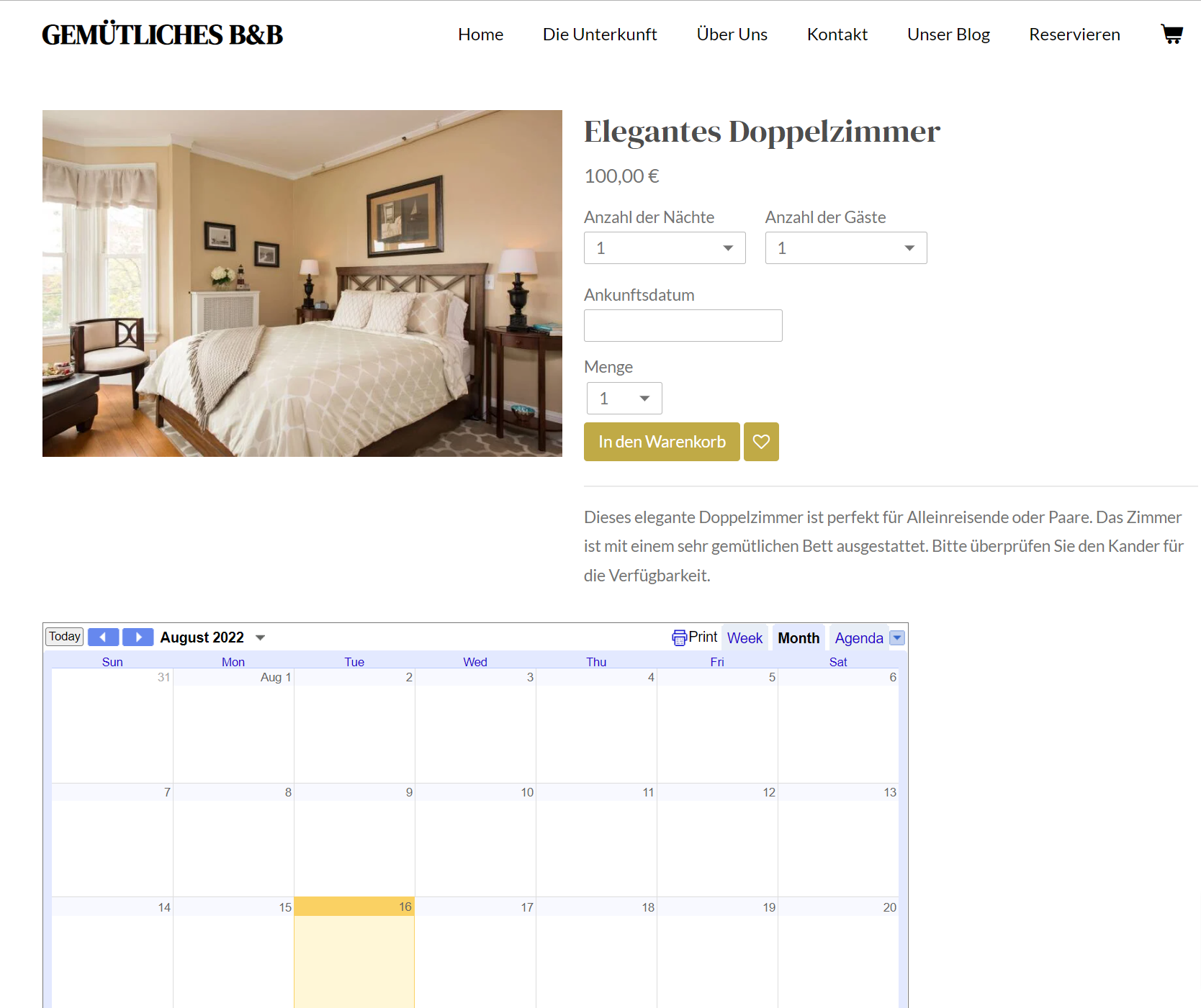 Der Verfügbarkeitskalender des Ferienhauses ist durch die Freigabe des Google-Kalenders sichtbar, der auf der Produktdetailseite mit einem Code einbetten-Element eingebettet ist. Der Kunde trägt das Datum seiner Ankunft in das Personalisierungsfeld ein.