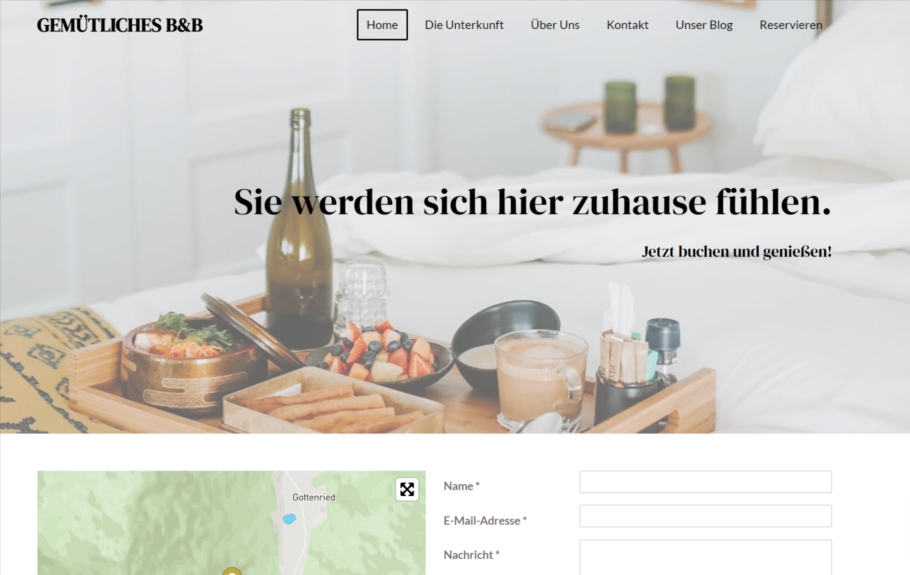 Die dritte Kategorie von Seiten, die für deine Website unerlässlich ist, ist eine Kontaktseite. Hier platzierst du deine Kontaktdaten, ein Kontaktformular und einen Lageplan der Unterkunft.