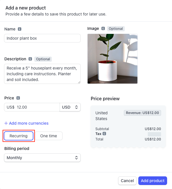 Enter the product name and price, and optionally enter a description and upload an image. Make sure Recurring is selected under the price, and in the drop-down that appears, select a billing frequency: