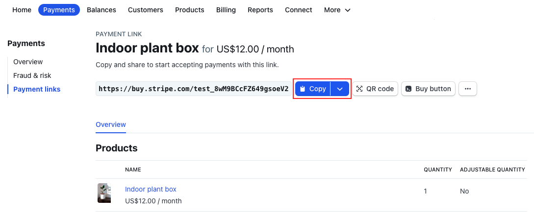 Click on the Create link button in the top right corner of the page to finish setting up your payment link. Back on the Payments page in Stripe, click on the Copy button to copy your payment link to the clipboard.