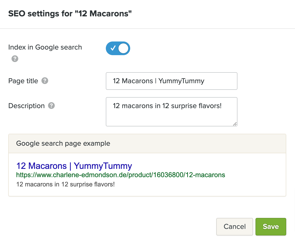 You can also enable the Index in Google search results option to make sure your products show up not only in Google search results, but also in search results via the internal search function on your website. You'll see a preview of how your products will be displayed in search results. If you disable this option, your products will not be shown in search results on Google or on your own website.