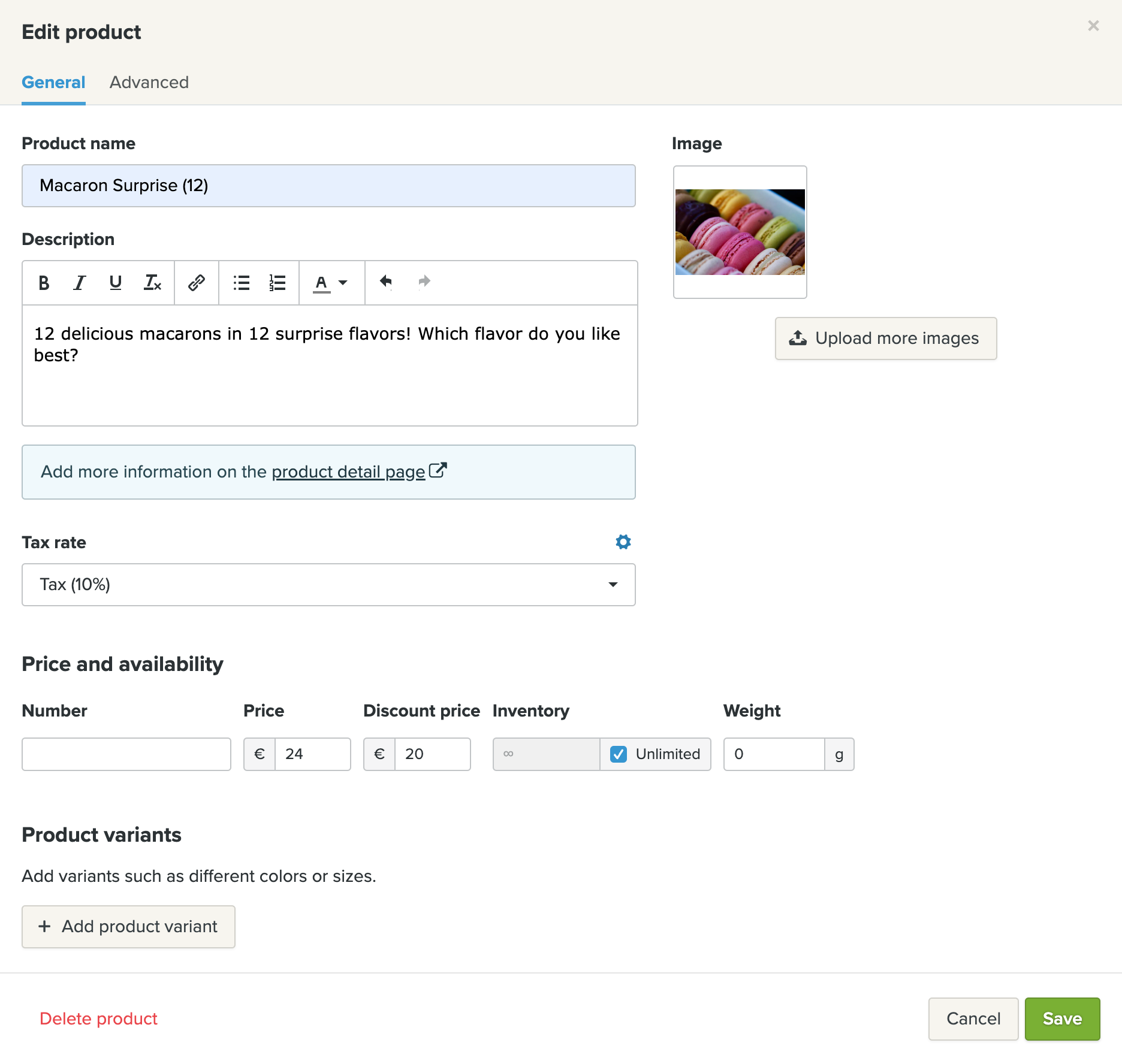 - Product variants: If your product comes in different sizes, colors, etc., you can add these here. You can even set different prices for different variations!