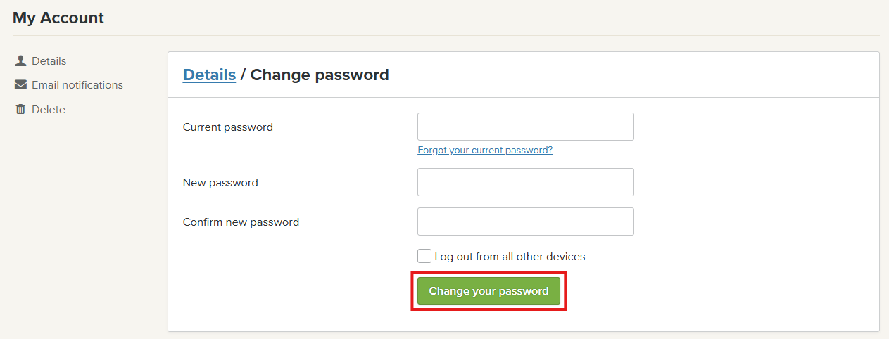 Enter your new password and click Change your password to confirm your changes.