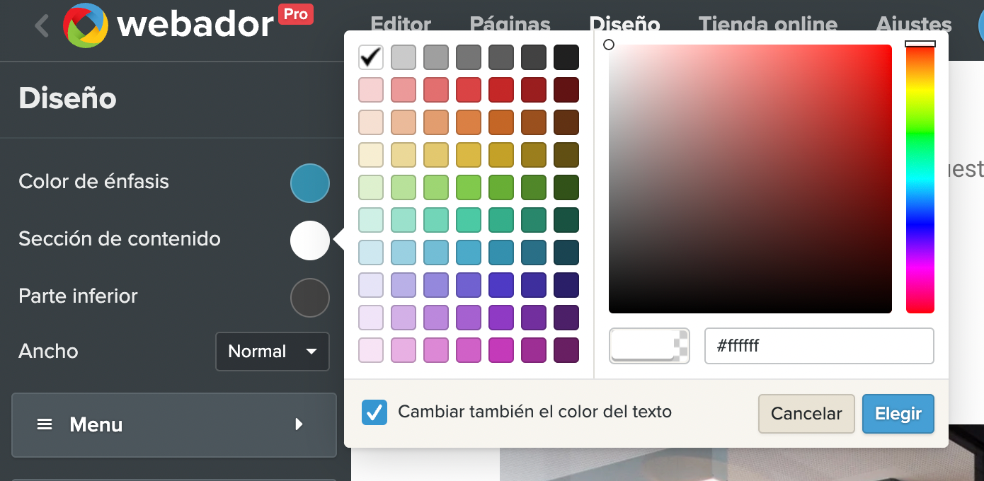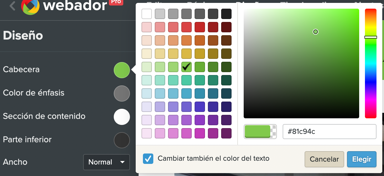 En el menú de configuración del diseño de la izquierda, haz clic en los círculos de color para personalizar tu combinación de colores.