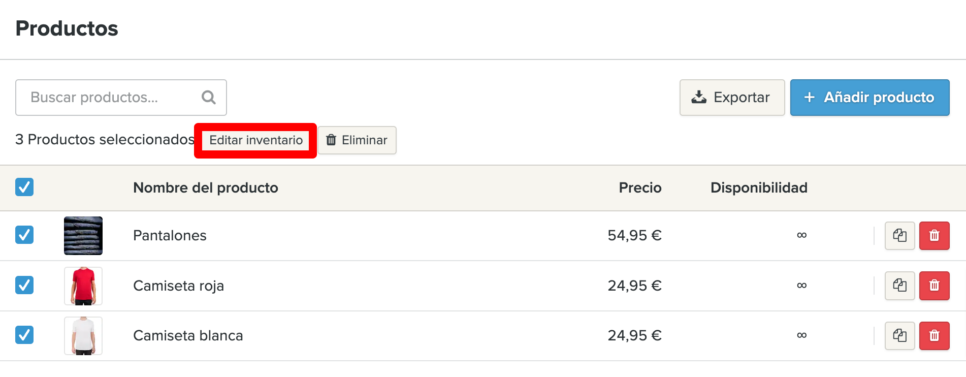 ¿Necesitas eliminar existencias de varios productos a la vez? Selecciona los productos correspondientes y haz clic en el botón Borrar existencias.