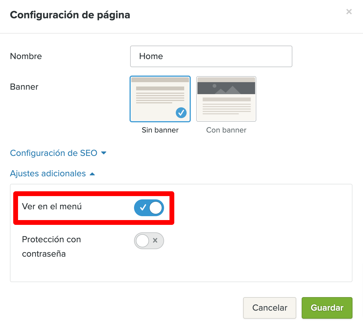 En el diálogo de configuración de la página, desactiva la opción Mostrar en el menú para eliminar la página del menú de tu web. A partir de ahora, esta página sólo será accesible a través de un enlace.