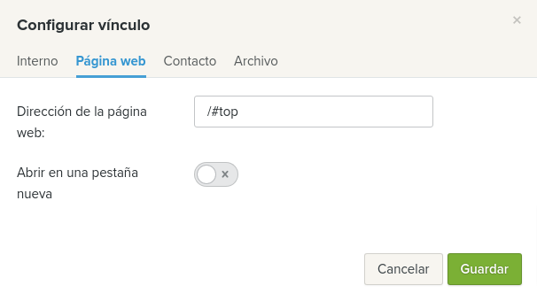 Elige la opción página web. Escribe /#top y asegúrate de que la opción Abrir en una nueva pestaña no esté marcada.