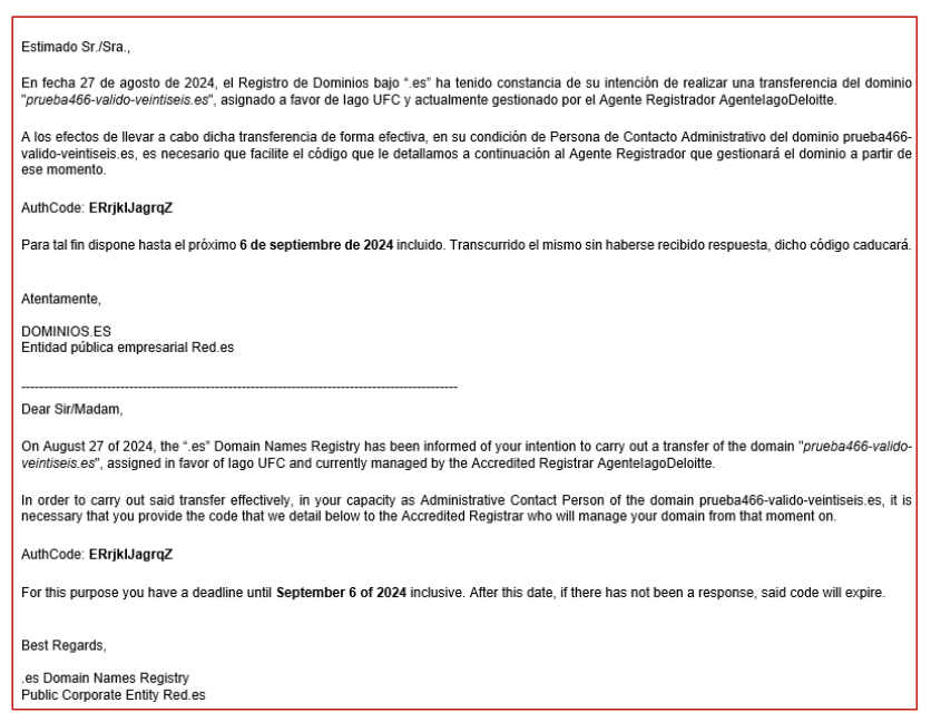 Cuando transfieres un dominio .es a otro registrador (agencia acreditada, proveedor), tienes que confirmar el proceso desde la dirección de correo electrónico administrativa de contacto asociada a dicho dominio.