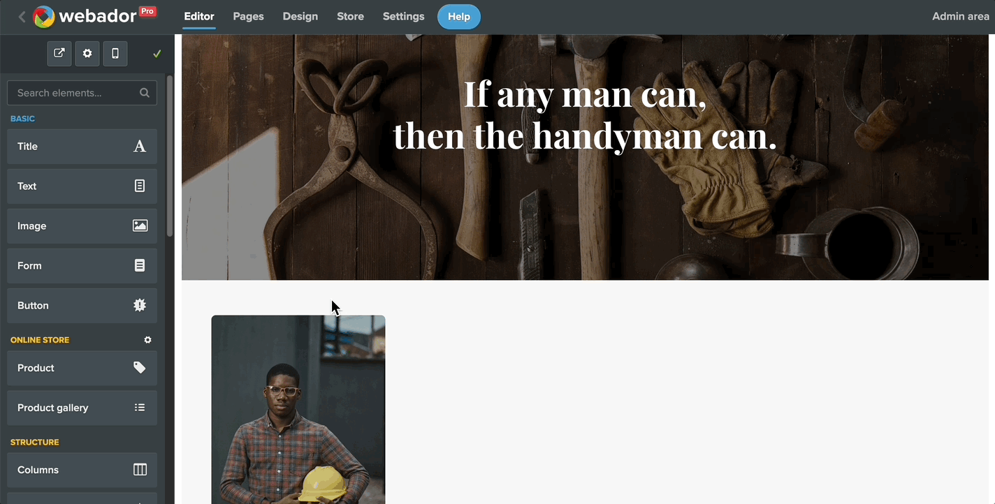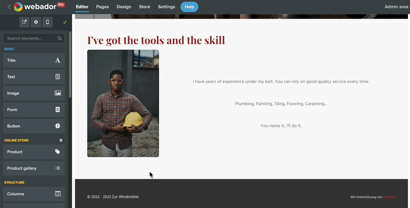 Haluatko todella tehdä verkkosivustostasi omasi? Yksi parhaista tavoista tehdä tämä on lisätä ja poistaa elementtejä – ajattele niitä sivustosi rakennuspalikkoina. Halusitpa lisätä kuvan, mukaansatempaavan tekstilohkon, yhteydenottolomakkeen tai jopa videon, Webador tekee sivujesi muokkaamisesta todella helppoa.