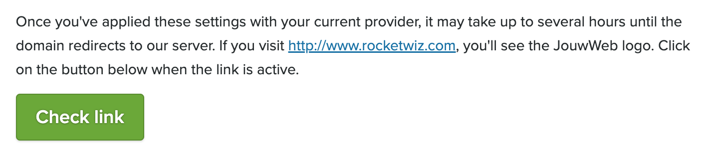 Näet nyt yleiskatsauksen vaadituista DNS-asetuksista. Jos nämä asetukset ovat oikein, napsauta vihreää Tarkista linkitys -painiketta. Verkkosivustosi pitäisi olla aktiivinen heti!