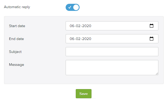 Ota käyttöön Automaattinen vastaus -vaihtoehto ja syötä Aloituspäivä, Lopetuspäivä, Aihe ja Viesti.