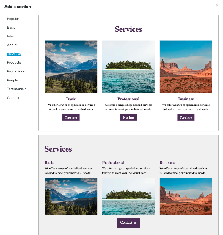 Selaa valmiiksi asetettuja Osio-kategorioita ja valitse yksi lisätäksesi sen verkkosivustoosi.