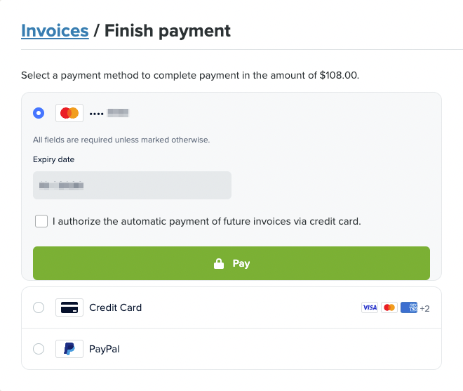 Valitse haluamasi maksutapa ja napsauta Maksa. Kun maksusi on käsitelty, tilaus siirretään vuosittaiseen laskutukseen.