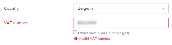 Voi olla, että sinulla on ALV-numero tai yritysnumero, mutta järjestelmämme ei hyväksy sitä. Kun näin tapahtuu, näet alla olevan virheilmoituksen.