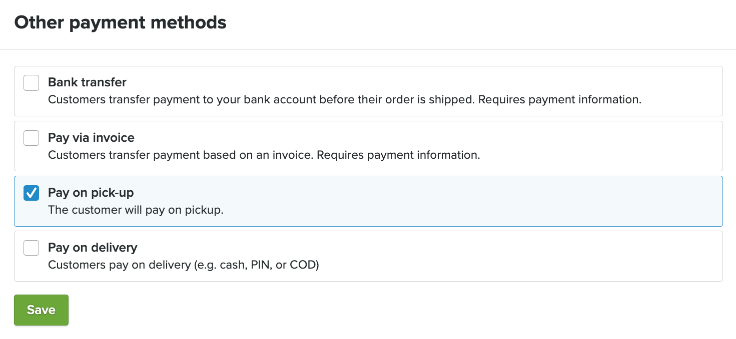 Voit myös ottaa käyttöön maksun noudon yhteydessä, jotta asiakkaasi voivat maksaa tilauksensa, kun he noutavat sen.