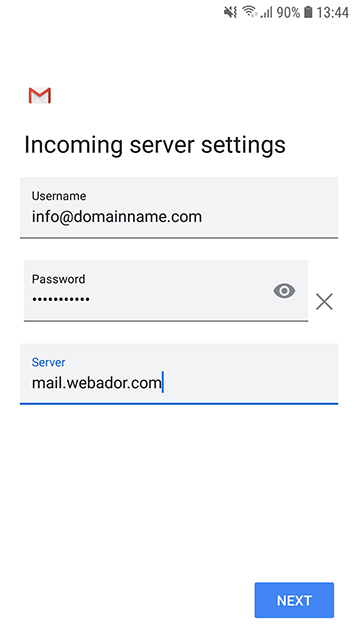 Vaihda palvelimeksi mail.webador.com (EI verkkotunnuksesi!) ja napauta Seuraava.