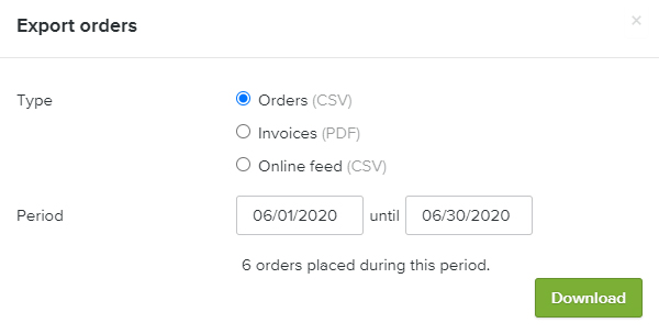 - Tilaukset: Määritä ajanjakso, jolta haluat viedä tilaukset, ja napsauta Lataa. CSV-tiedosto latautuu, ja voit avata sen haluamassasi kirjanpito-ohjelmistossa.