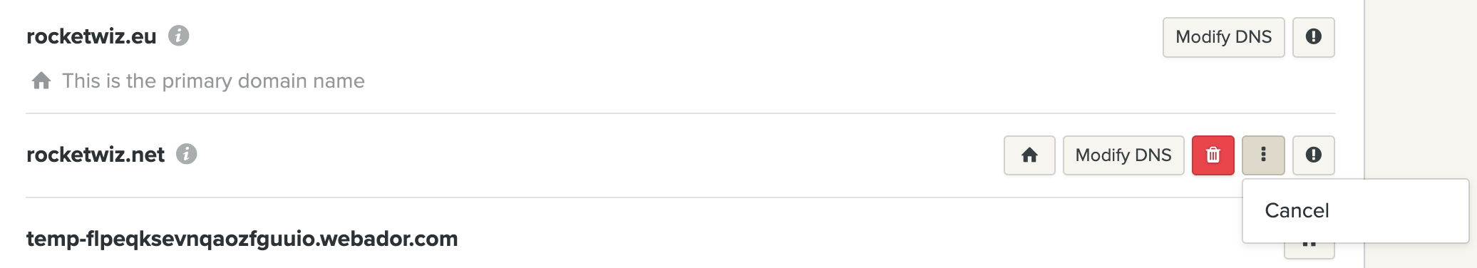 Siirry kohtaan My Sites ja napsauta oikeaa tilaussivua napsauttamalla punaista tunnistetta. Peruuta vanha verkkotunnus napsauttamalla Manage domains. Napsauta painiketta, jossa on 3 pistettä vanhan verkkotunnuksesi oikealla puolella. Napsauta sitten Cancel.