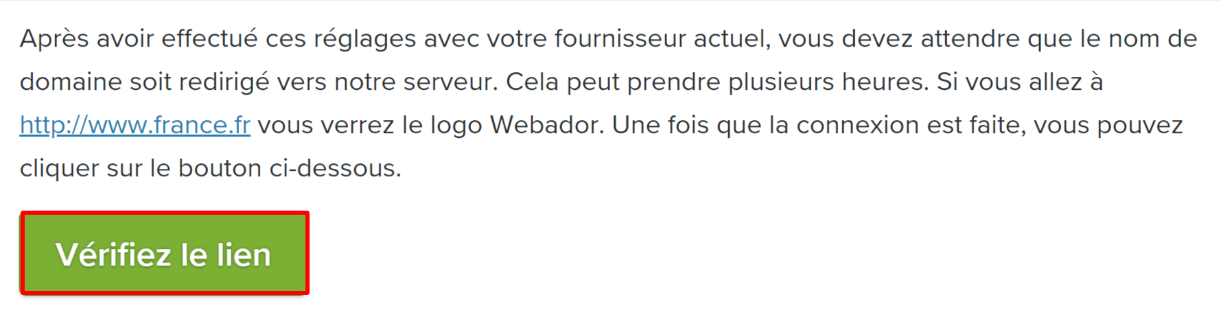 Un aperçu des paramètres des DNS requis s'affiche alors. Si ces paramètres sont corrects, cliquez sur le bouton vert Vérifier le lien. Votre site devait être activé immédiatement.
