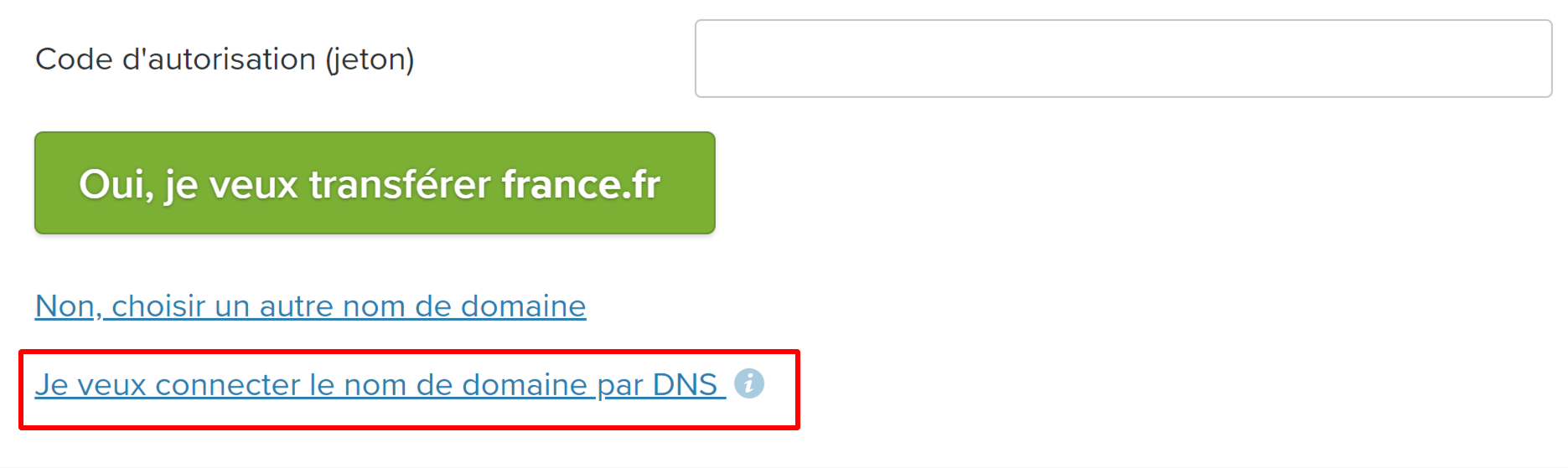 Vous devez alors saisir le code de transfert. Cliquez sur Je veux lier le nom de domaine par DNS.