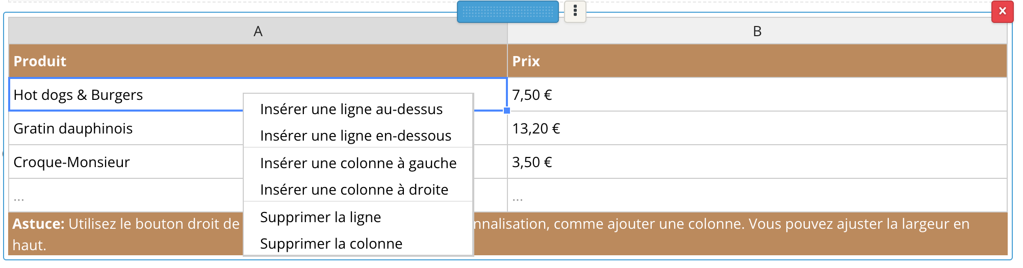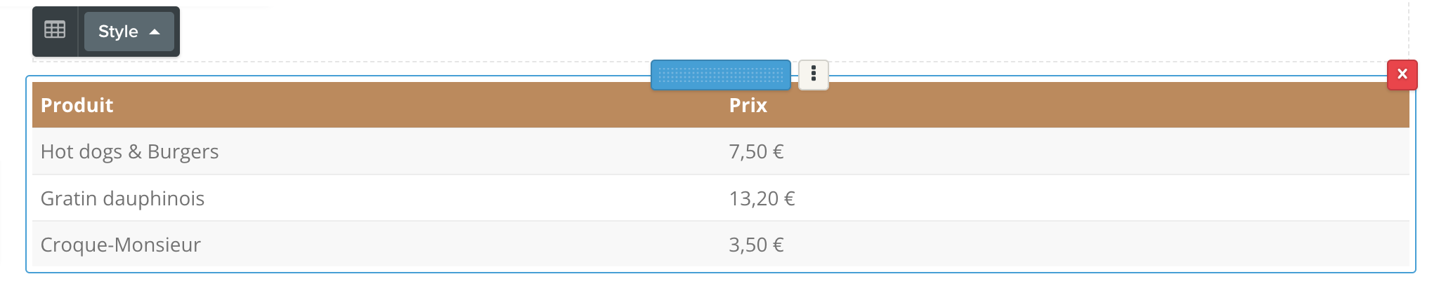 Vous pouvez utilisez l'élément tableau sur votre page pour par exemple créer facilement une liste de prix ou un menu.