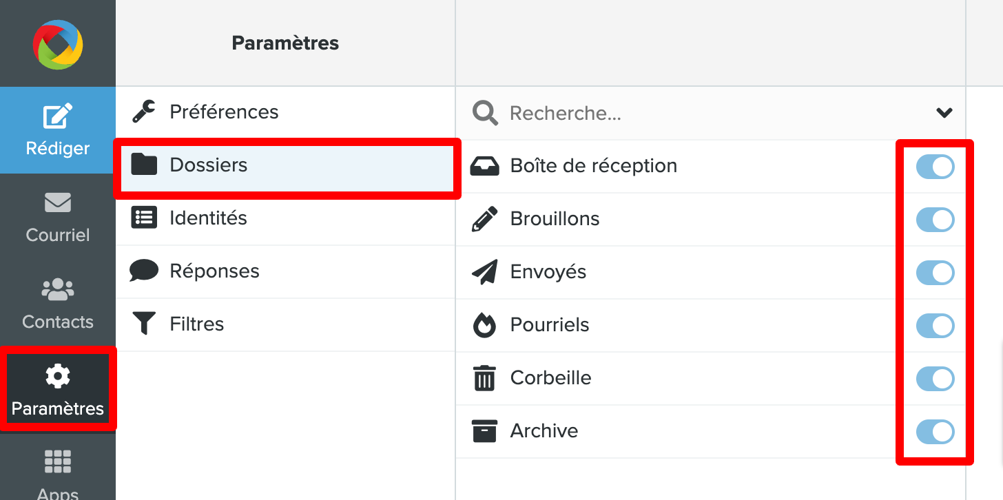 Sur la page suivante, cochez les dossiers décochés pour les faire apparaître dans votre messagerie.