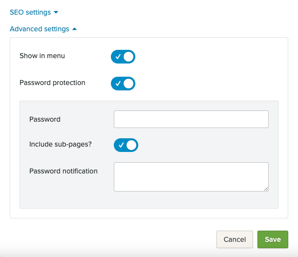 Aggiungi una nuova pagina e scegli Impostazioni aggiuntive. Abilita l'opzione Protezione con password. Puoi impostare la password desiderata per la pagina e anche determinare quale messaggio vedranno i visitatori quando tenteranno di raggiungere questa pagina.