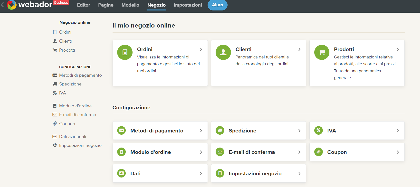 Le impostazioni sono suddivise in una serie di schede. Prima di tutto puoi visualizzare i tuoi Ordini, Clientie Prodotti. Sotto questi vengono visualizzate le opzioni relative alle impostazioni: Metodi di pagamento, Spedizione, IVA, Modulo d'ordine, Email di conferma, Coupon, Dati aziendalie Impostazioni negozio.