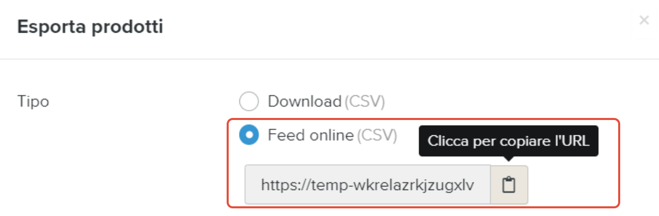Prodotti da feed online: scegliendo questa opzione, ti verrà fornito un URL da copiare ed incollare nel tuo Google Merchant Center.