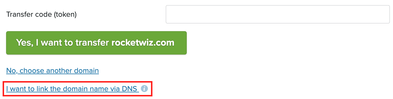 Du vil da bli spurt om du ønsker å skrive inn en overføringskode. Klikk på Jeg ønsker å koble domenenavnet via DNS.