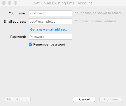 Gode nyheter – Mozilla Thunderbird kan automatisk konfigurere Webador-postbokser! Alt du trenger å gjøre er å skrive inn e-postadressen og passordet for postboksen din, som vist i eksempelet nedenfor.