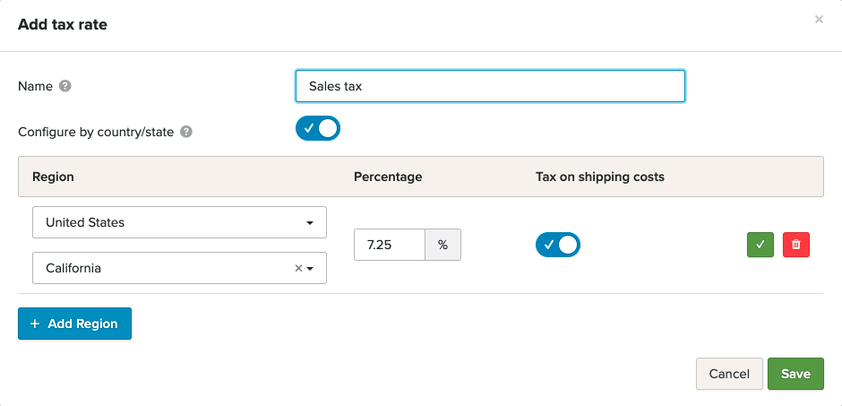 I Avgiftsatser-delen legges en omsetningsavgift til som standard. Omsetningsavgift gjelder kun i USA. For å redigere denne satsen, hold musepekeren over den og klikk på den blå redigeringsknappen. For å fjerne den, hold over og klikk på den røde slett-knappen.
