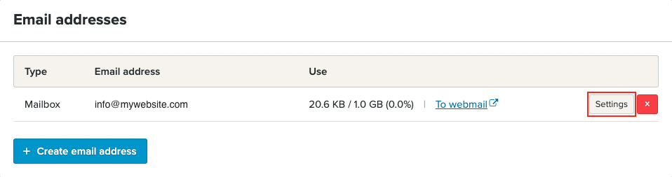 I boksen E-postadresser klikker du på lenken Administrer e-postadresser, og klikker deretter på Innstillinger ved siden av e-postadressen du vil sette opp automatisk svar for.