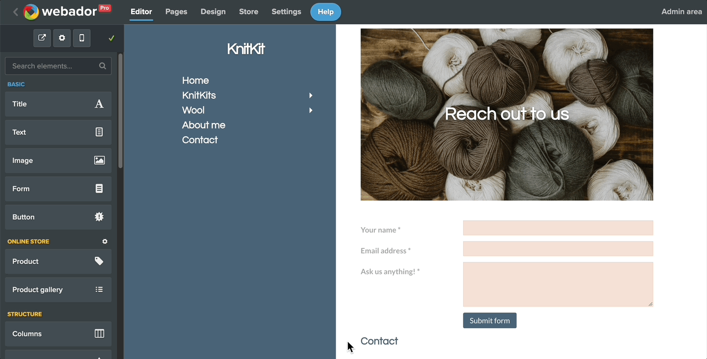 Du kan redigere elementer på nettsiden din i Redaktør, som er tilgjengelig via navigasjonsfeltet øverst.