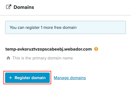 I boksen Domener, klikk på den blå knappen + Registrer domene eller + Ekstra domene.