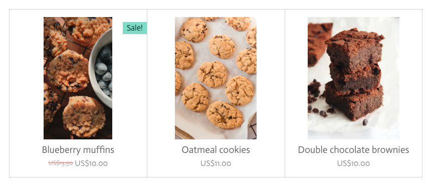 For å gi visse produkter mer synlighet, kan du sette ned prisen. Produktet vil da vise etiketten «Salg!», og den opprinnelige prisen vil vises med gjennomstreking.