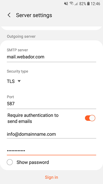 - SMTP-server: mail.webador.com (IKKE domenenavnet ditt).