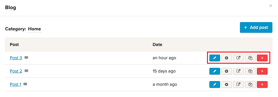 Klikk på knappen Administrer blogg for å redigere blogginnlegg, endre innstillinger og duplisere eller slette innlegg.