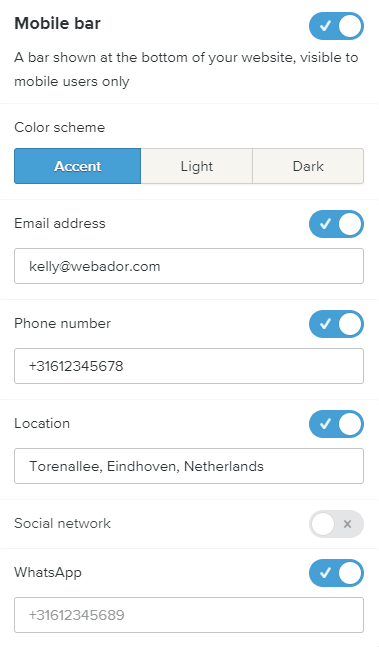 - WhatsApp: Skriv inn et telefonnummer slik at besøkende kan kontakte deg via WhatsApp.