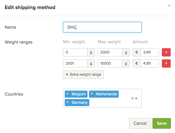 Angi en minimums- og maksimumsvekt (gram), en pris og landene du sender til.