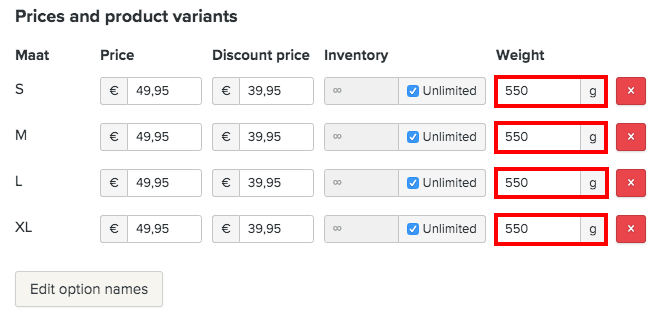⚠ Merk: Sørg for at produktvektene dine faller innenfor minimums- og maksimumsvektene du har satt i fraktmetodene dine. Hvis disse verdiene ikke stemmer, vil ikke fraktmetoden vises i kassen, og kundene dine vil se en feilmelding.