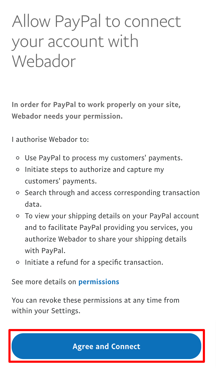 Opprett en PayPal-konto eller logg inn med din eksisterende konto. Klikk på Godta og koble til for å tillate at PayPal kobler kontoen din til Webador.