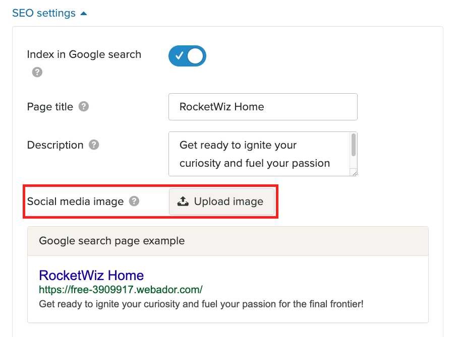 I SEO-innstillingene, klikk på knappen Last opp bilde for å laste opp bildet ditt for sosiale medier.