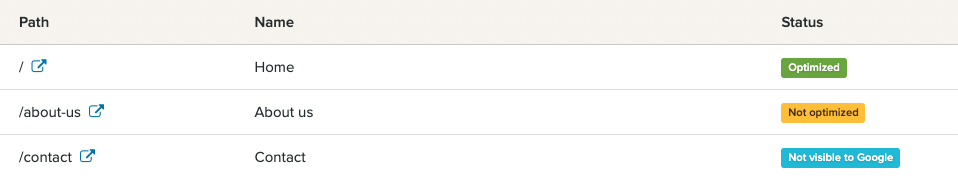 - Ikke synlig for Google: Denne etiketten betyr at du har deaktivert Indeksering i Google Search-valget. Fordi denne siden eller produktet ikke er synlig, er det ikke nødvendig med optimalisering.