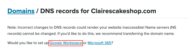 Øverst på DNS-postsiden klikker du på lenken Google Workspace.