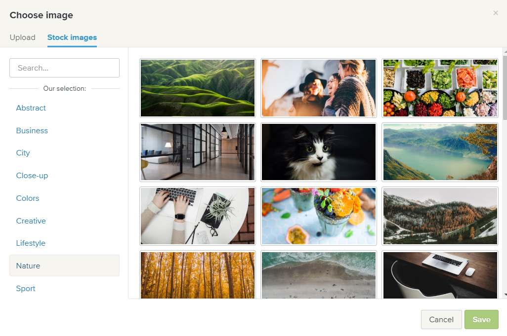 I dialogboksen Velg bilde, klikk på Last opp for å laste opp ditt eget fane-bilde fra datamaskinen din, eller klikk på Arkivbilder for å velge et bilde fra Webadors gratis bibliotek.