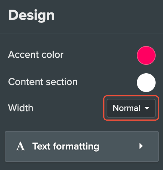 I menyen til venstre ser du valg for designinnstillinger. Klikk på rullegardinmenyen Bredde og velg Smal, Normal eller Bred.